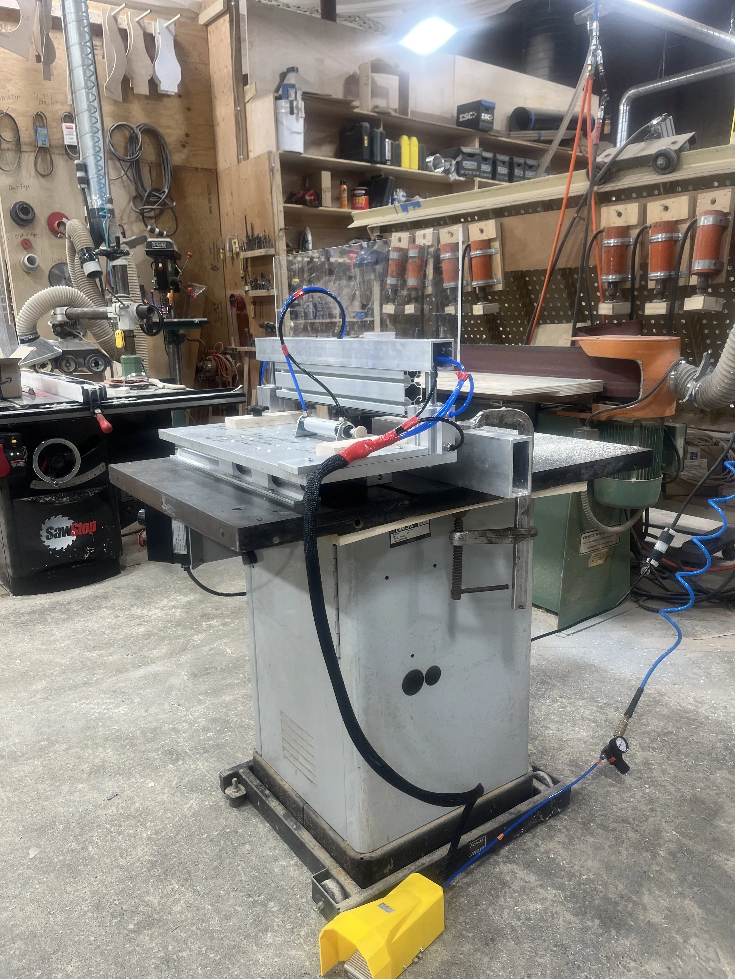 This sled is perfect for the shop that does everything. You can cope 5 or more cabinet door rails safely and accurately at a time saving an amazing amount of time or do giant exterior bottom door rails of over 17'' knowing that the parts will come out perfect every time. Vertical clamps have well over 500lbs of clamping force on the combined double pressure bar. Pressure is easily adjusted for harder or softer woods via pressure control switch located at the operators finger tips. If you already have a sliding table shaper purchase the table only or purchase the entire setup for standard machines. If your existing table does not slide perfectly true then I would suggest purchasing the entire unit to get the benefits of the new linear rails.